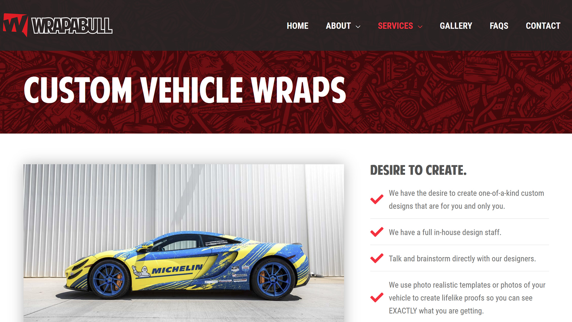 Brandcentric conducted a thorough analysis of Wrapabull’s needs. This involved identifying key messaging, organizing content and planning the site’s structure. We determined the best way to display Wrapabull’s portfolio of work, such as using photo galleries or case studies and how to present their different services.